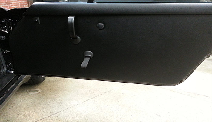 Aftermarket door card modified to fasten to the door with snaps instead of the typical screw fasteners.